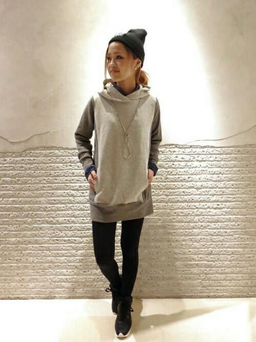 出典:https://voi.0101.co.jp/ ネイビーのフード付きチュニックに柄パンツ。ちらりと見せる足首が女性らしさをUP♪
