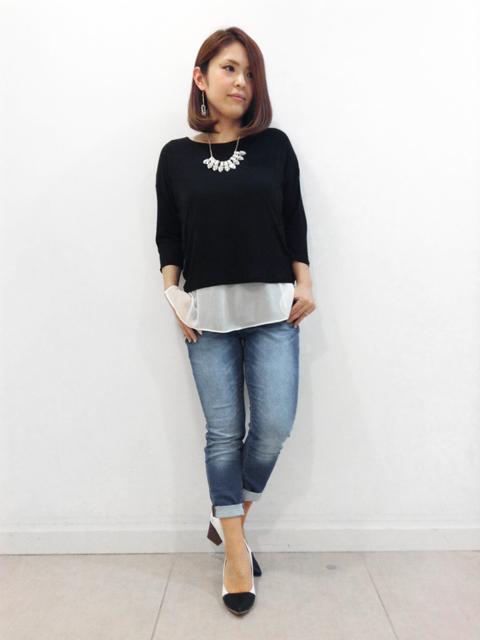 出典:https://pbs.twimg.com/ 異素材コンビのトップスとネックレス、バイカラーのヒールといった上品で大人目なアイテムを、デニムでカジュアルダウン。
