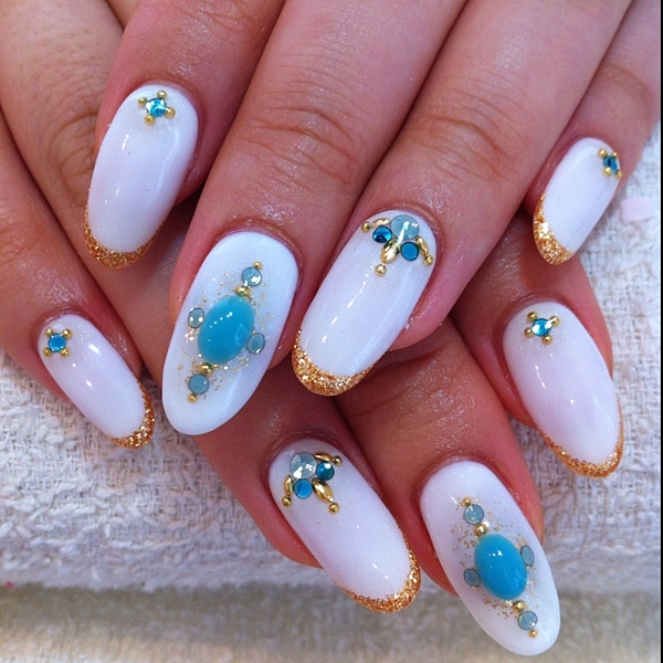 出典:http://img-cdn.jg.jugem.jp/ 白とピンクのベースカラーにターコイズカラーのストーンとゴールドスタッツで大人でオリエンタルな雰囲気のネイル!