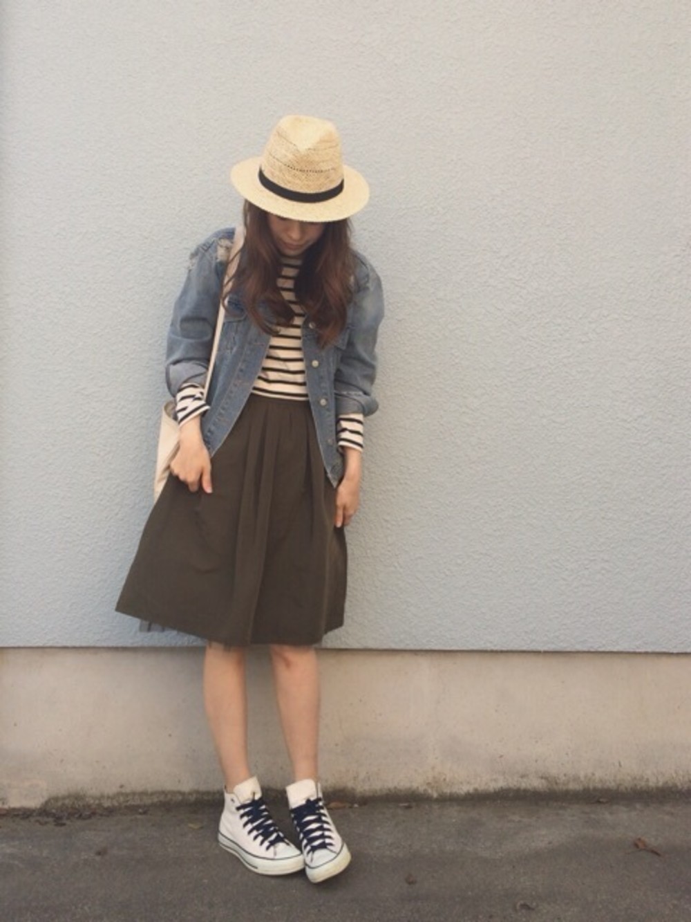 一見ラフなコーデも、つばの広いストローハットで、お嬢様気分をプラス。