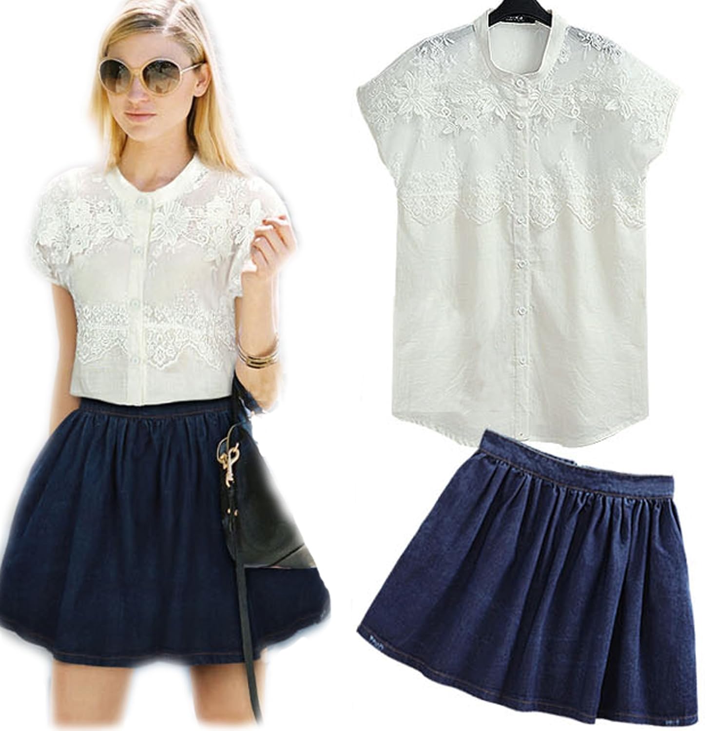 ミニ丈のデニムフレアスカートには、白いオフショルシフォンブラウスを合わせて少女っぽく♪