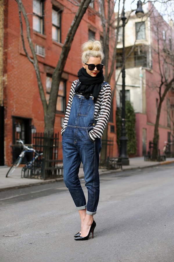 こちらもオーバーオールのデニムをロールアップ。全体をモノトーンで仕上げた中に、きらっと光る☆ブロンズの髪がなんともうらやましい…。