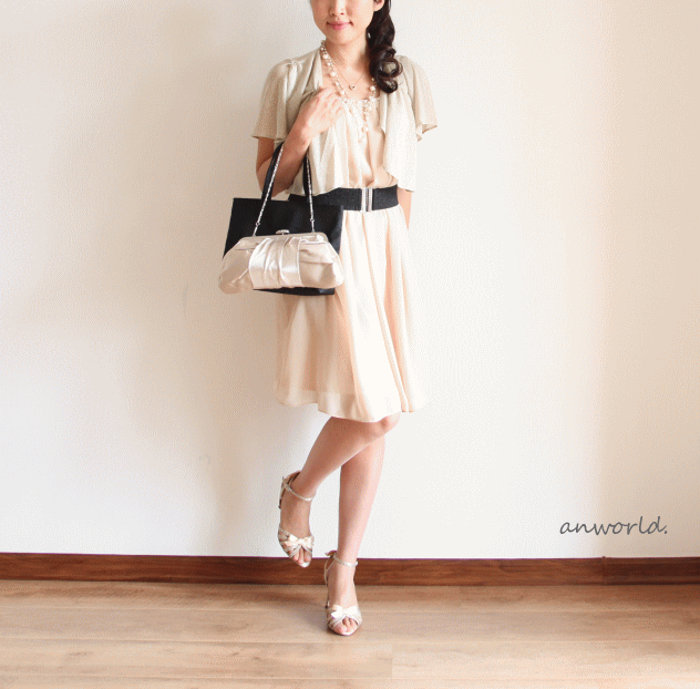 メインのクラッチバッグとはあえて違う色でコーディネートするのもメリハリがついて素敵ですね♪