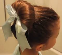 ポニーテールして、前に向かってクルクル巻いてピンで留めます。根元に爽やかな白い大きなリボンを。