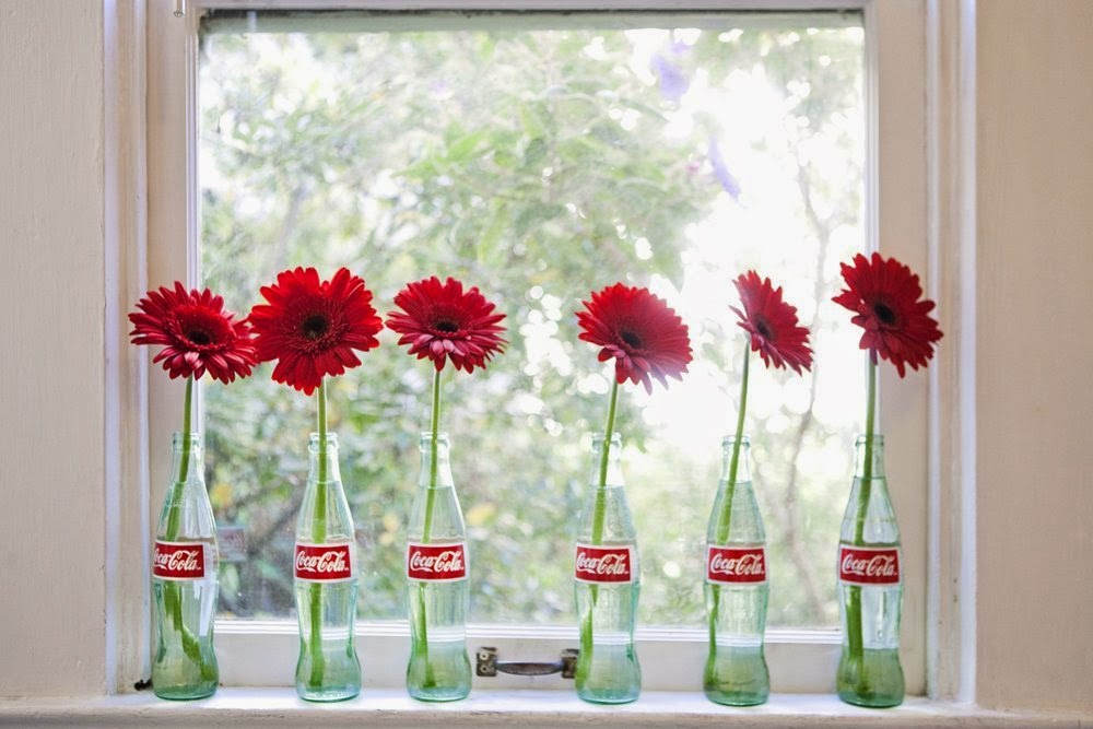 ビンのロゴの色に合わせて赤いガーベラを。ユーモアあふれるアイディア♪